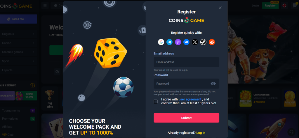 Betting on CoinsGame is more straightforward than other platforms. Users can register with an existing account from leading web, social media, and messaging platforms. Here’s how.