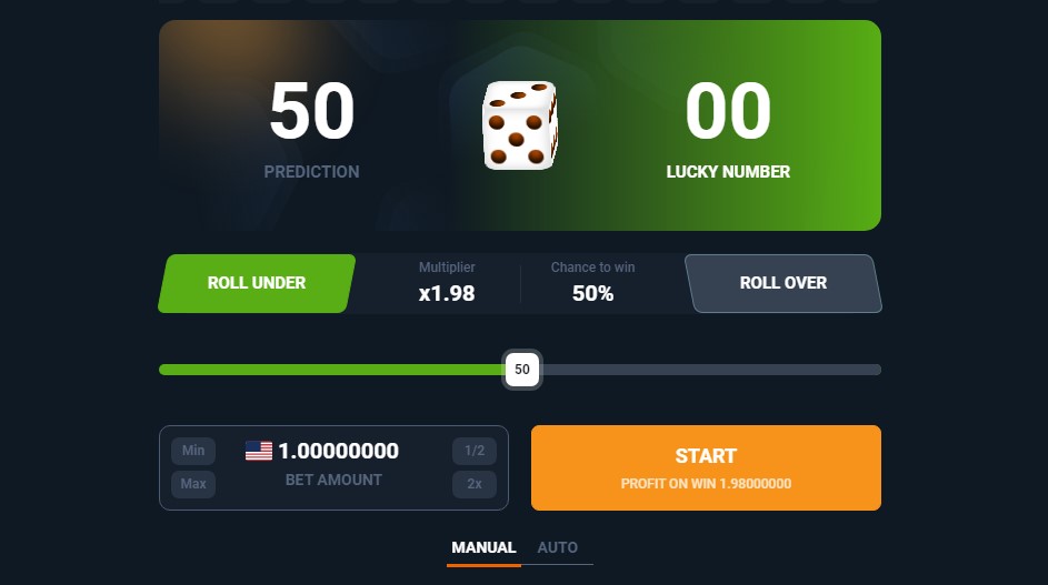 - Dice – A classic game of die rolling with a twist, where players win depending on whether their prediction is above or below the target number.