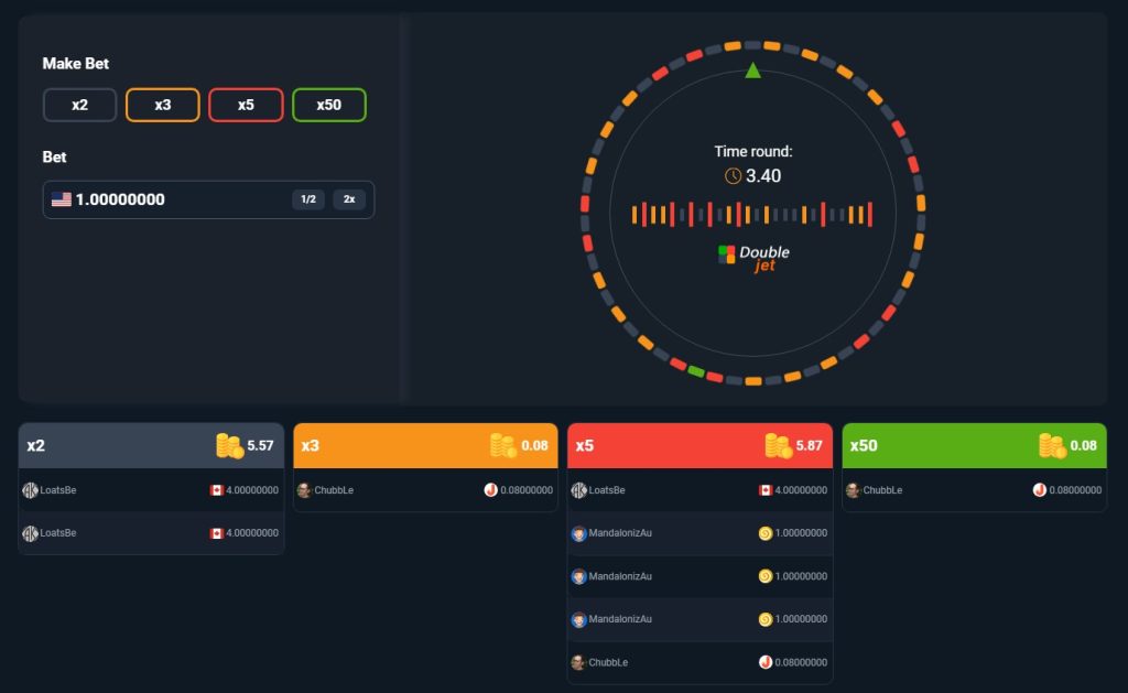 - Double – A roulette-style game where players bet on four multipliers, from x2 to x50.